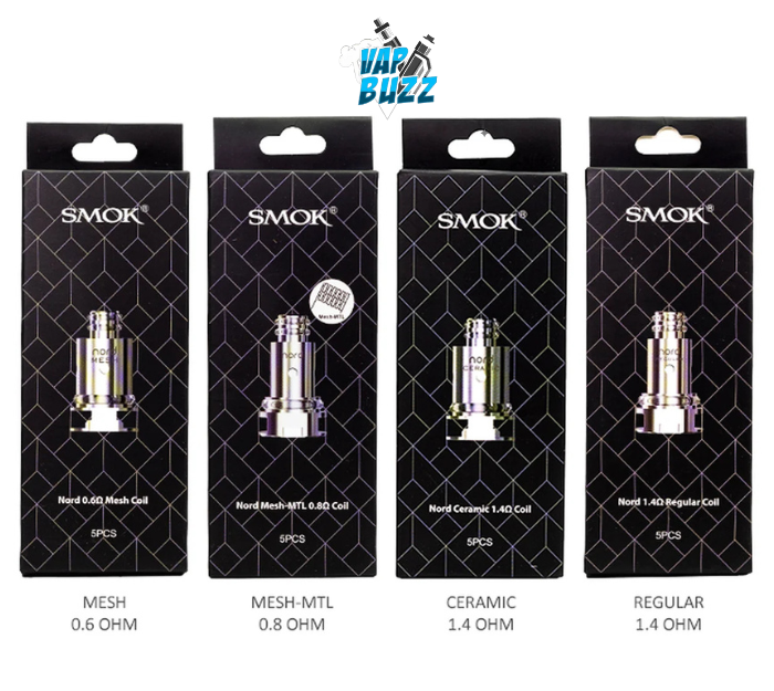 SMOK NORD Coils (5-Pack), a dynamic atomizer structure for the NORD, Trinity Alpha, PRIV N19 and more, featuring the following coil options: 0.6ohm Mesh, 0.8ohm Mesh-MTL,1.4ohm Ceramic, and a 1.4ohm Traditional.